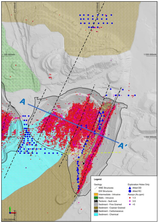 The 2,200 m by 500 m Tambali deposit lies approximately 600 m southwest of the Sadiola Main Deposit (see Figure 1). Its western extent is controlled by a graphitic unit which lies at a north-northwest trending, limestone-clastic sediment contact. Multiple corridors of northeast-trending intrusion- to sediment-hosted gold mineralization that extend towards the Sadiola Main open pit may be correlated to the northeast trending zones in the Sadiola Main Pit. The upper, oxide gold mineralization portion of the deposit was mined until 2023 with production of approximately 403,000 ounces of gold(1). Historic drilling indicates that the oxide gold mineralization is open to the north and in local areas within the pit. Over the last couple of years, Allied has carried out several modest drill campaigns to test the fresh rock portions of this deposit with dual goals of defining near surface fresh rock mineral resources which could be processed in the Sadiola mill as needed and testing for additional oxide gold mineralization.