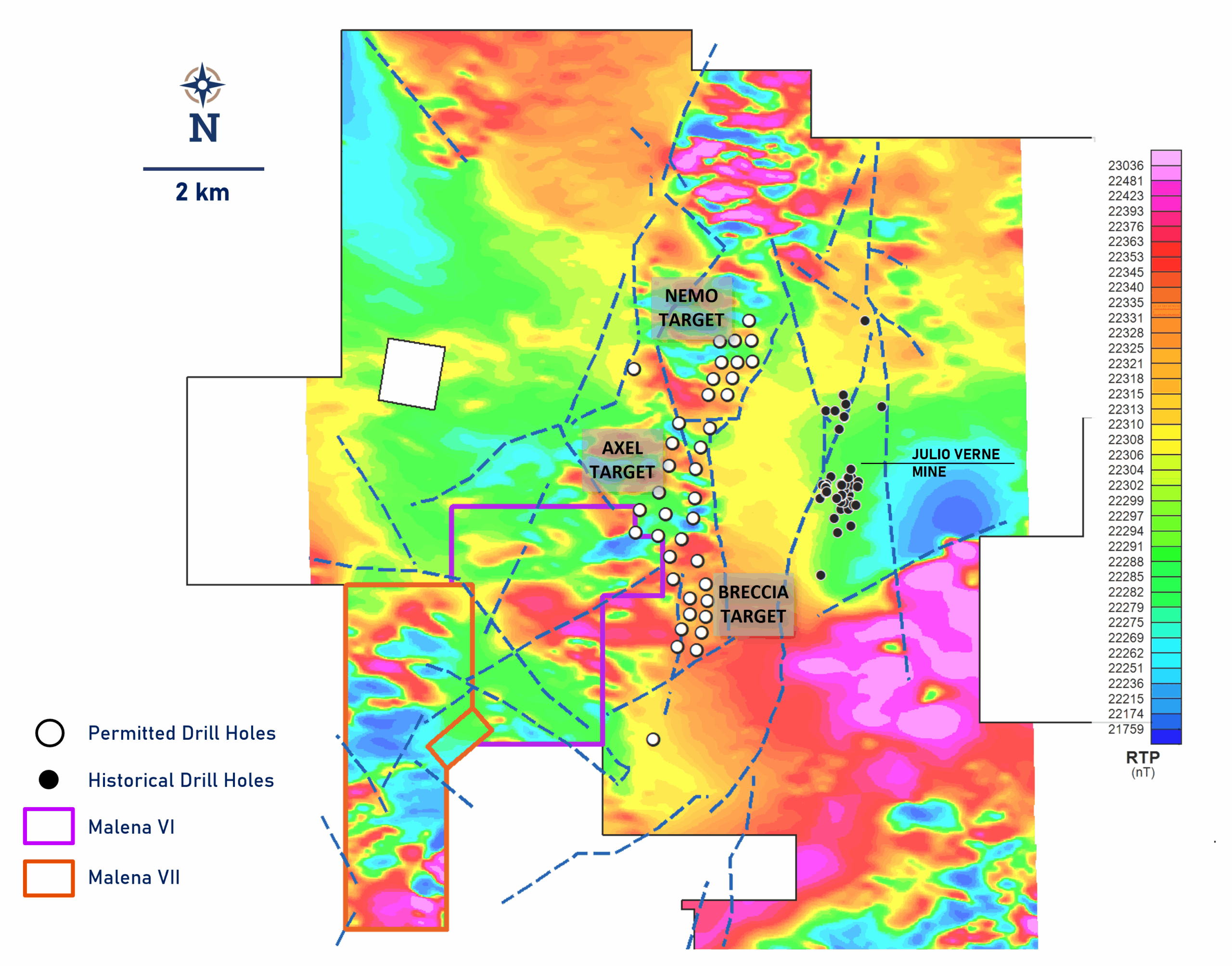 permitted drill holes, historical drill holes, and the recently acquired Malena VII property.