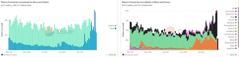 Meanwhile, starting July 26, the daily average number of tokens minted on the Base network has surpassed that of Solana for three consecutive days — a historical first. In terms of token issuance market share between Base and Solana, the Zora platform has led consistently since July 23. As of July 28, a total of 51,575 tokens were minted on Zora, accounting for 62.69% of all tokens minted on Base that day — exceeding the combined issuance of peer projects Letsbonk and pump.fun.