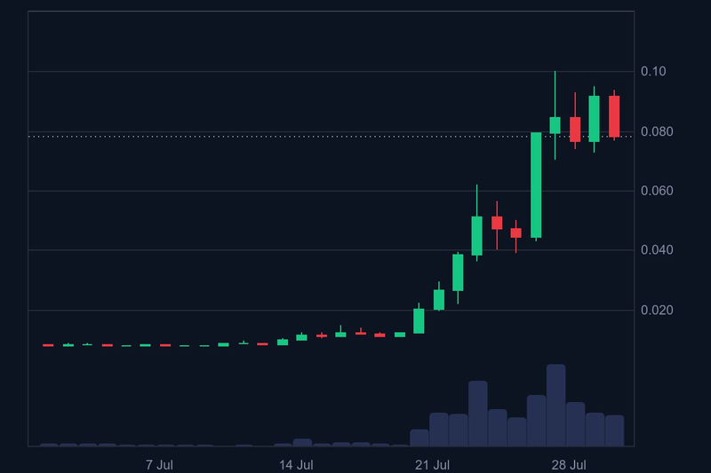 As of July 30, the ZORA token has risen from approximately $0.008 at the beginning of the month to $0.078, briefly hitting an all-time high of $0.1003 on July 27. The token recorded a monthly gain of approximately 875%, with its market capitalization peaking at $781 million, making it one of the most closely followed projects in the current market cycle.