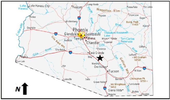 The Claims, which are comprised of seventy-two (72) 20-acre claims, total approximately 1,440 acres in size. The Claims are located in Pinal County, Arizona, approximately 85 miles southeast of Phoenix (Figure #1) and are in two contiguous areas, one containing 1,240 acres and the other block containing 160 acres. Figure # 2 also provides a more detailed location of the placer claims.