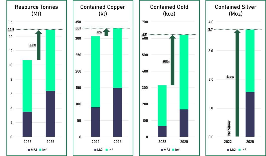- Inferred: 182 kt Cu, 454 koz Au & 2.2 Moz Ag (for 295 kt CuEq or 1.3 Moz AuEq)