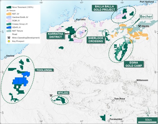 Figure 1: Novo Pilbara and Onslow District Tenure showing priority gold prospects.
