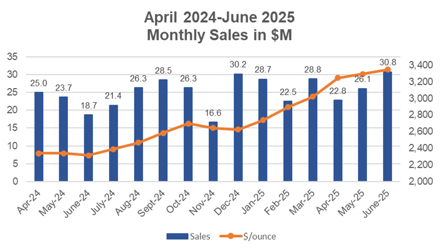 - Gold sales reached a record of $30.8 million (C$42.2 million1) in June 2025, compared to $18.7 million (C$25.6 million) in June 2024.