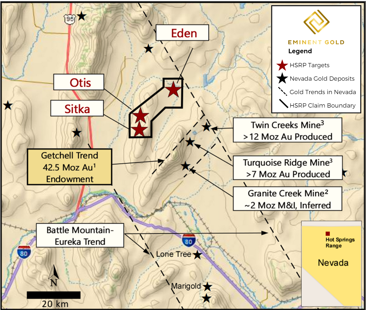 VANCOUVER, British Columbia, Nov. 18, 2024 (GLOBE NEWSWIRE) — Eminent Gold Corp. (TSX-V: EMNT) (OTCQB: EMGDF) (the “Company” or “Eminent”) is pleased to announce the commencement of its inaugural core drilling program at the Otis Target Area within its Hot Springs Range Project (“HSRP”), located in northern Humboldt County, Nevada (Figures 1 and 2). The initial phase of the program (“Phase 1”) is expected to consist of 1,000 meters using one drill rig targeting a potential parallel structure to the Getchell Trend which hosts the Turquoise Ridge and Twin Creeks deposits only 15 – 20 km southeast of HSRP.