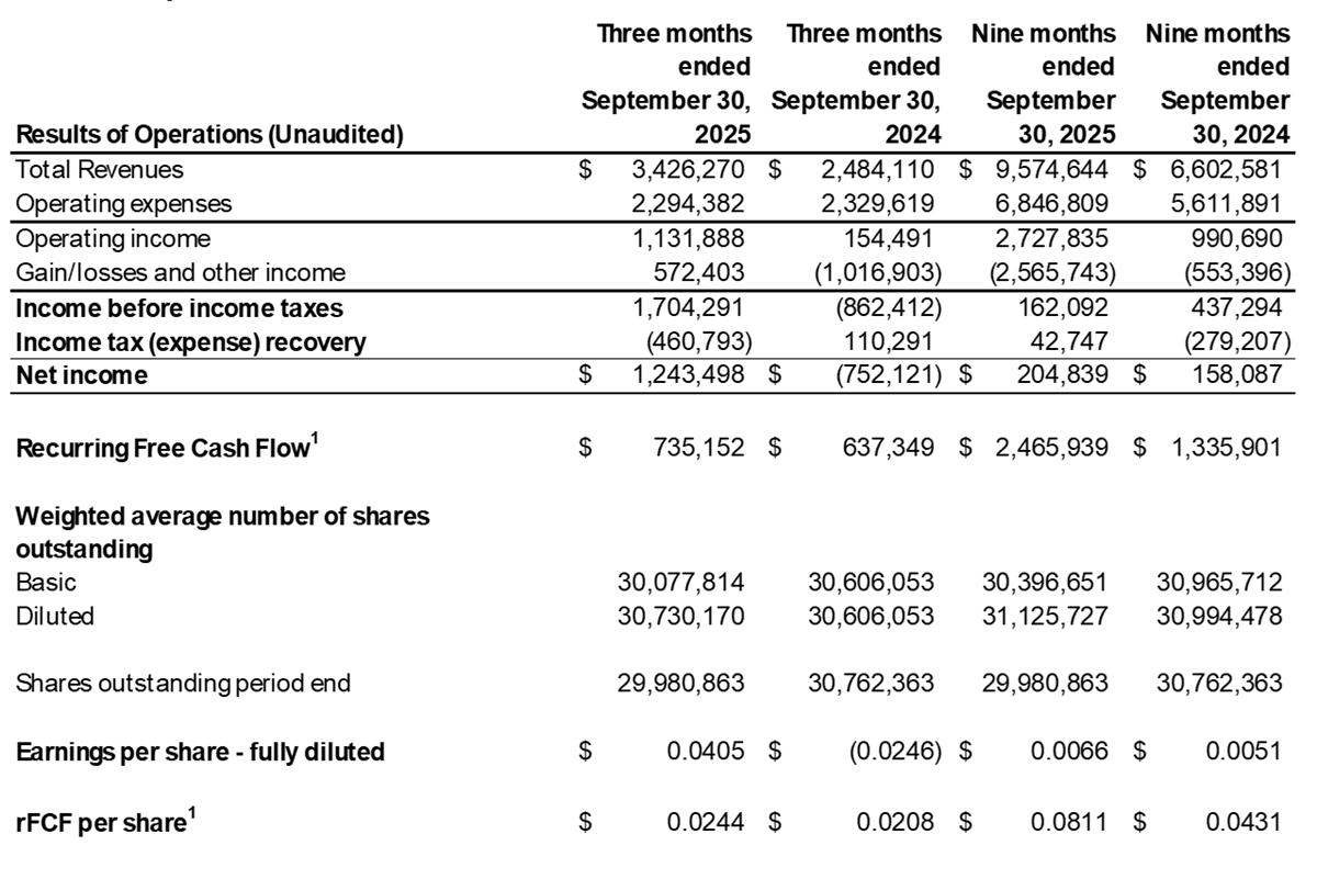 “Q3 2025 represented the 9th consecutive quarter of revenue growth with record quarterly revenue of $3.4 million. Associated with this record revenue was strong recurring free cash generation of $735 thousand and $2.5 million for the three- and nine-months periods ended September 30, 2025, respectively.” said Alex Baluta, CEO of Flow Capital.