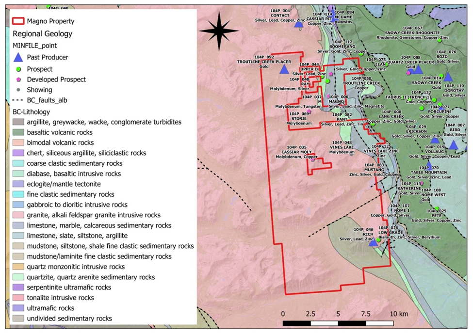 The Magno property is a district-scale, polymetallic property with 24 mineral tenures located in the Liard Mining Division, adjacent to the historic Cassiar mining district, in Cassiar BC, Canada.