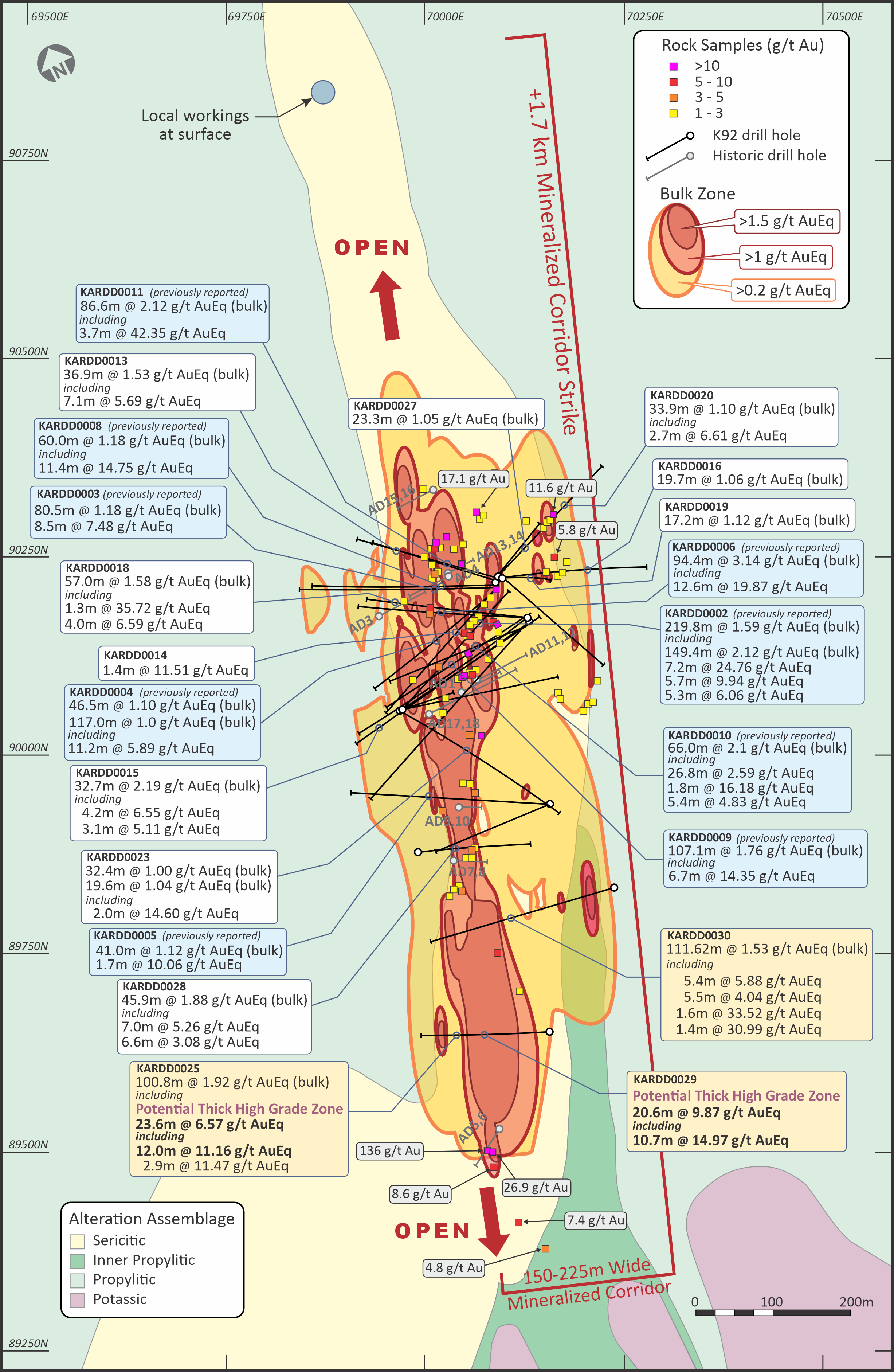 - K92 has defined a substantial interpreted bulk tonnage zone extending over 750 meters, with bulk tonnage intersections reported to date recording an average true thickness of 56 meters and mineralization reaching a vertical depth of up to 350 meters. In addition to the bulk intersections at KARD0025 and KARDD0030, highlights include: