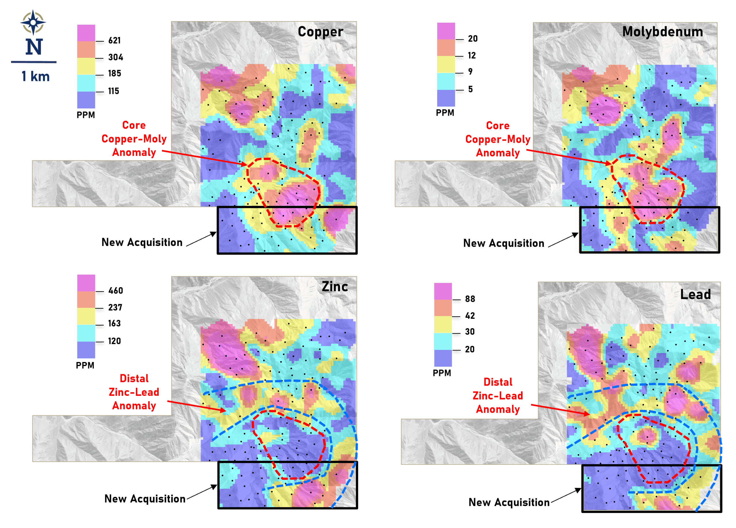 Figure 1: Results of Latin Metals’ geochemical talus sampling survey showing favorable chemical zonation interpreted as centering on a porphyry system. Proximal and coincident copper and molybdenum anomalies are interpreted to overlie a porphyry system, and coincident zinc and lead anomalies are distal, surrounding the core copper-molybdenum anomalies. This pattern is typical of porphyry systems. New property acquisition shown.