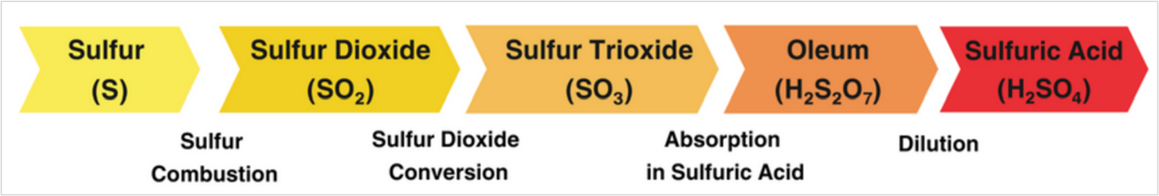 The industrial process is very well understood and involves heating elemental sulfur to its molten state before injecting it into a reaction chamber with oxygen to create sulfur dioxide gas. Sulfur dioxide is then passed over a catalyst to create sulfur trioxide gas. Hydrogen is then absorbed with oxygen, prior to a final dilution with water to achieve the desired acid concentration.
