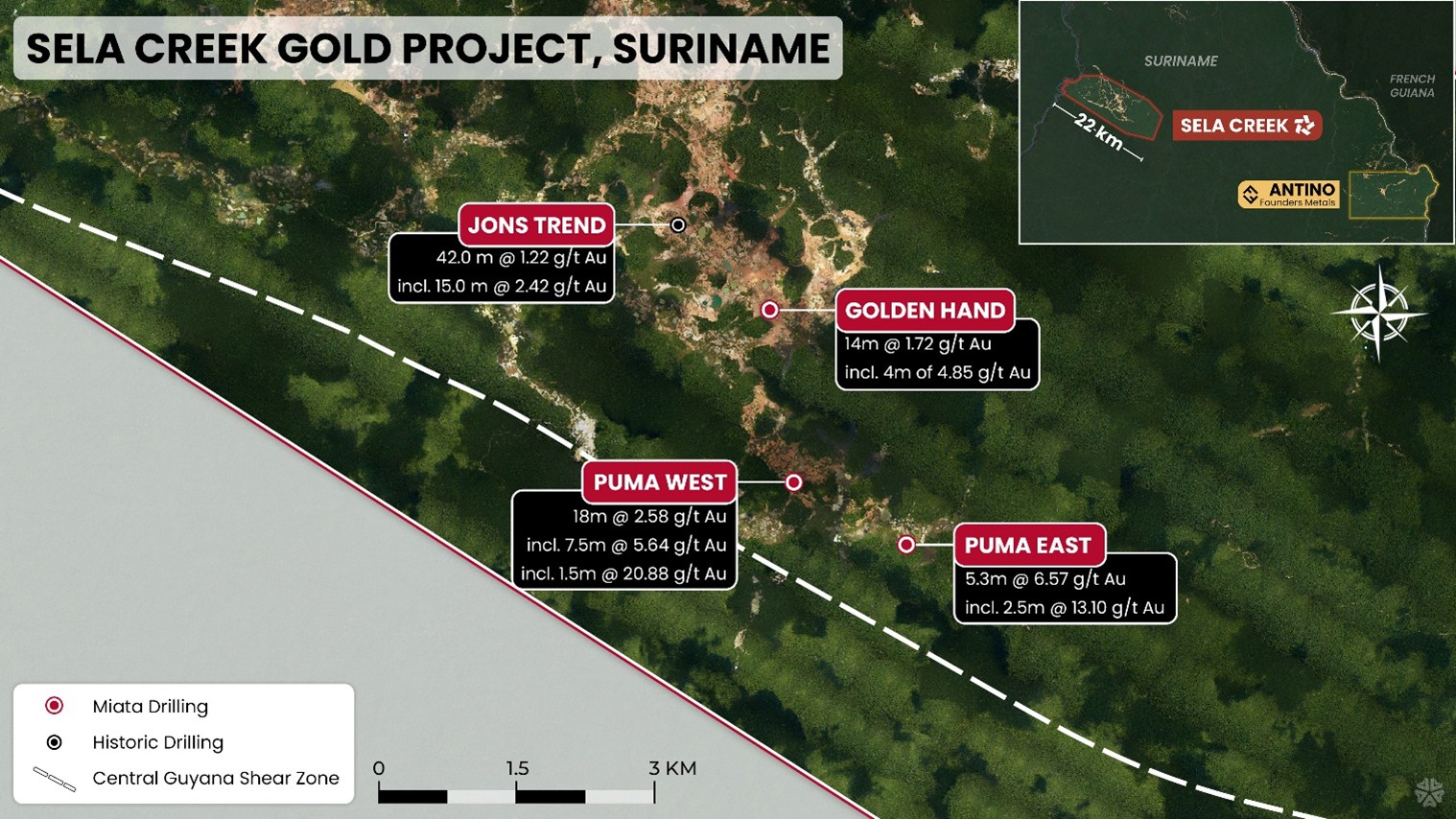 VANCOUVER, British Columbia, Sept. 16, 2025 (GLOBE NEWSWIRE) — Miata Metals Corp. (CSE: MMET) (FSE: 8NQ) (OTCQB: MMETF) (“Miata” or the “Company”) is pleased to announce significant drill results from two different targets at its Sela Creek Gold Project (“Sela Creek” or the “Project”) in Suriname. Results include near-surface, high-grade mineralization in hard rock at the Puma Target (“Puma”) and wide mineralized intervals at depth at the Golden Hand Target (“Golden Hand”), further demonstrating the district-scale potential of Sela Creek.