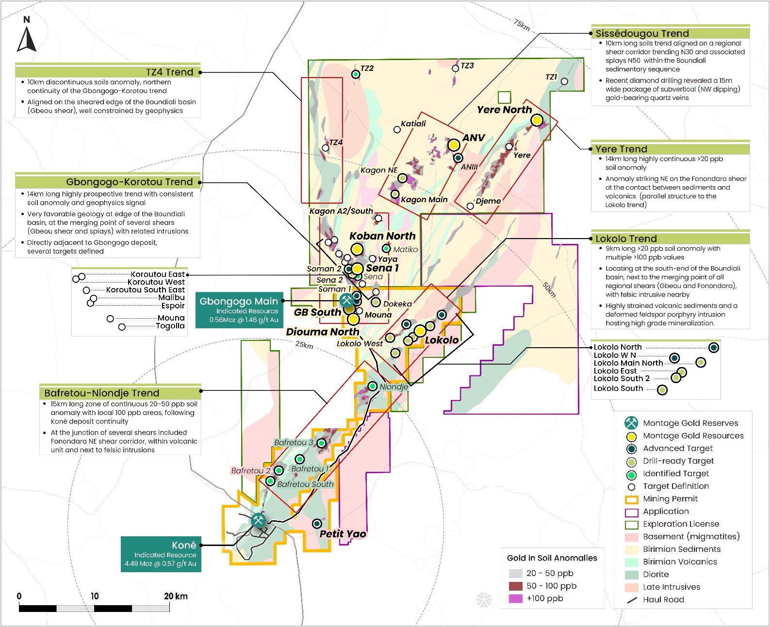- The Sissédougou trend is emerging as another highly prospective area, in addition to the recently announced success on the Gbongogo–Koroutou trend where 5 satellite deposits were already delineated with a further 19 targets identified