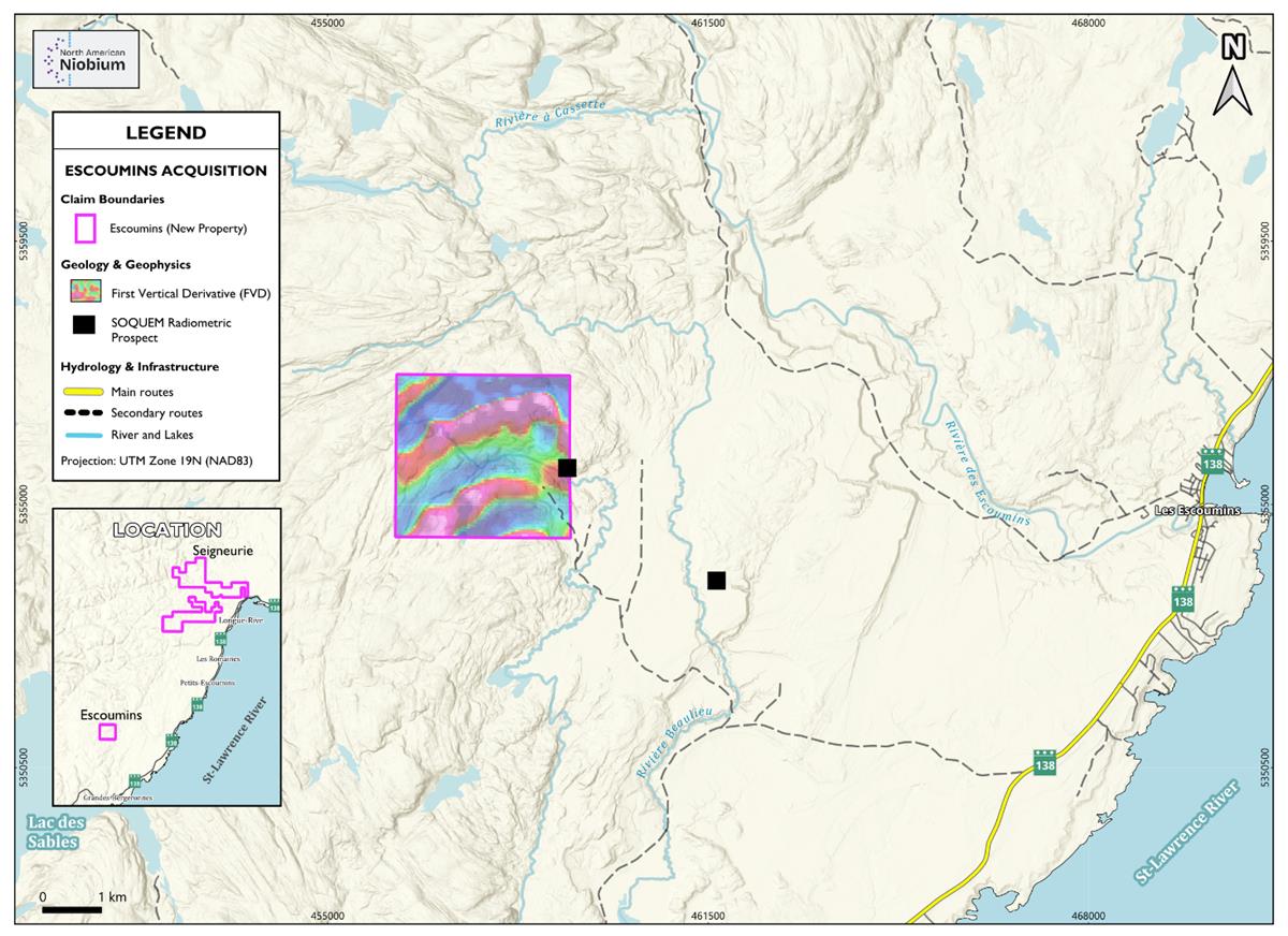 Vancouver, British Columbia, Dec. 18, 2025 (GLOBE NEWSWIRE) — North America Niobium and Critical Minerals Corp. (CSE: NIOB) (FSE: IOR) (OTCQB: NIOMF) (“North American Niobium” or the “Company”) is pleased to announce that it has acquired additional mineral properties in Québec. The Company has (i) extended the Seigneurie Property through the acquisition of additional claims and (ii) added a new, exploration project in the Escoumins municipality.