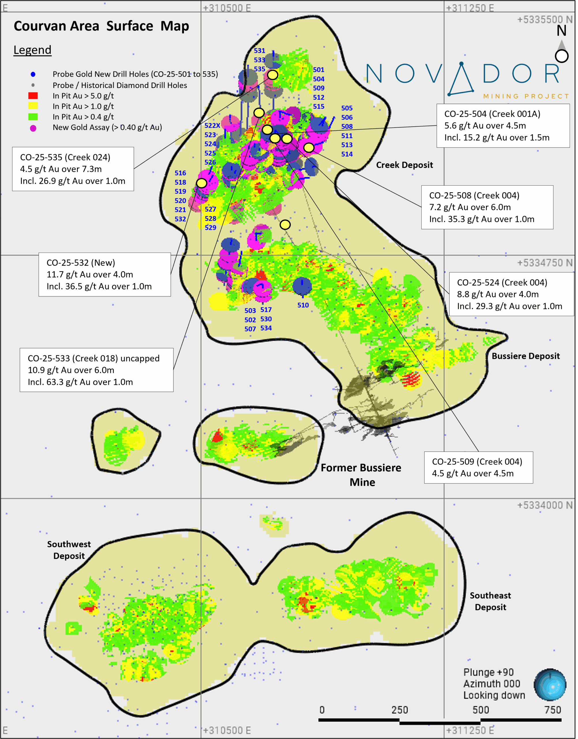 David Palmer, President and CEO of Probe, states, “The infill drilling program at Novador continues to deliver strong results, confirming mineral continuity and underscoring meaningful expansion potential along strike and at depth at Courvan. These winter drill results will play a critical role in supporting resource conversion and will be incorporated into the upcoming Pre-Feasibility Study, an important step forward in advancing Novador toward development. We’re making steady progress across key areas, including permitting, resource growth, and mine plan optimization. Backed by a strong treasury, we remain fully committed to positioning Novador as a top-tier gold development project.”