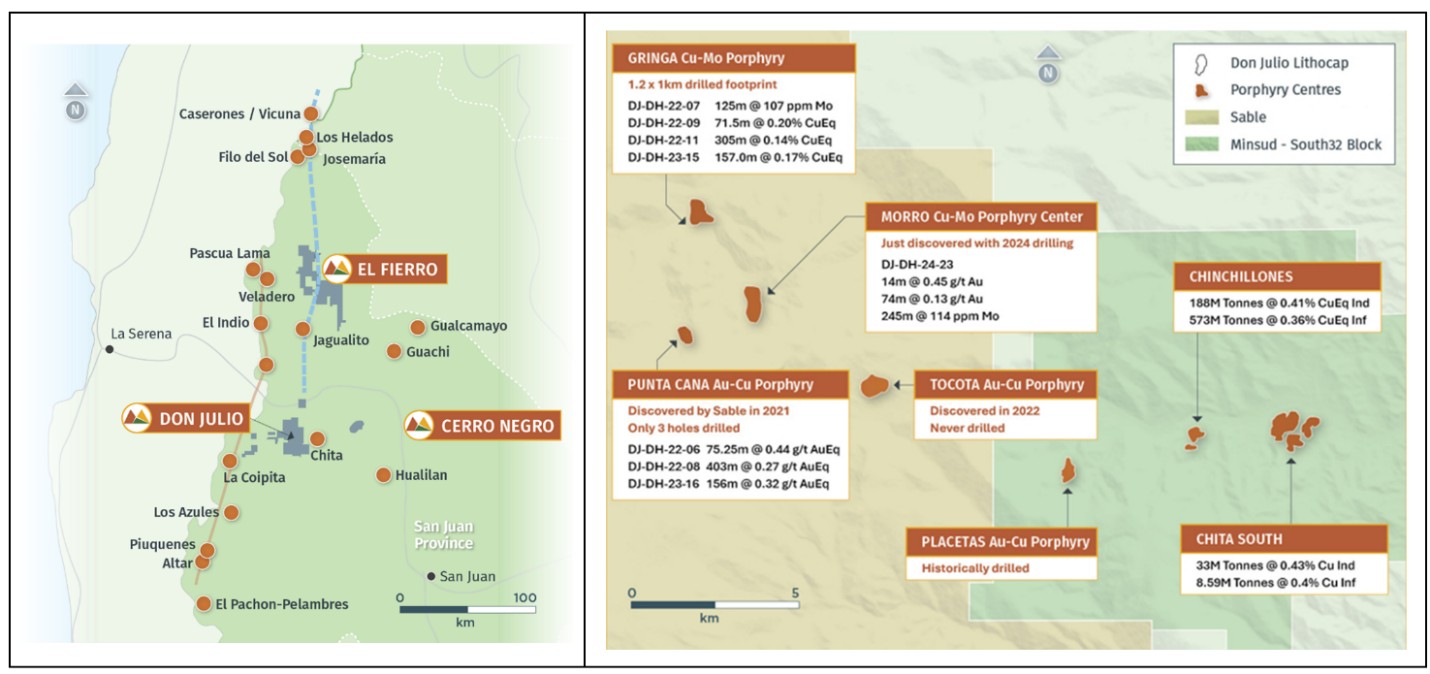 Sable’s Don Julio property (69,350 hectares) is situated along the highly endowed Central Andes Miocene Mineral Belt, which contains large Cu-Au (Mo, Ag) porphyry mineral centers, including the Vicuña, Los Azules, Altar, and El Pachon porphyry district. Sable plans to use its in-house porphyry exploration expertise and extensive Don Julio’s database to leverage advanced targeting and follow-up drilling at this Tier One exploration asset.