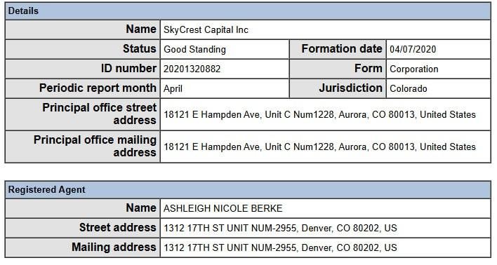 Agent Address: 1312 17th St Unit Num-2955, Denver, CO 80202, United States