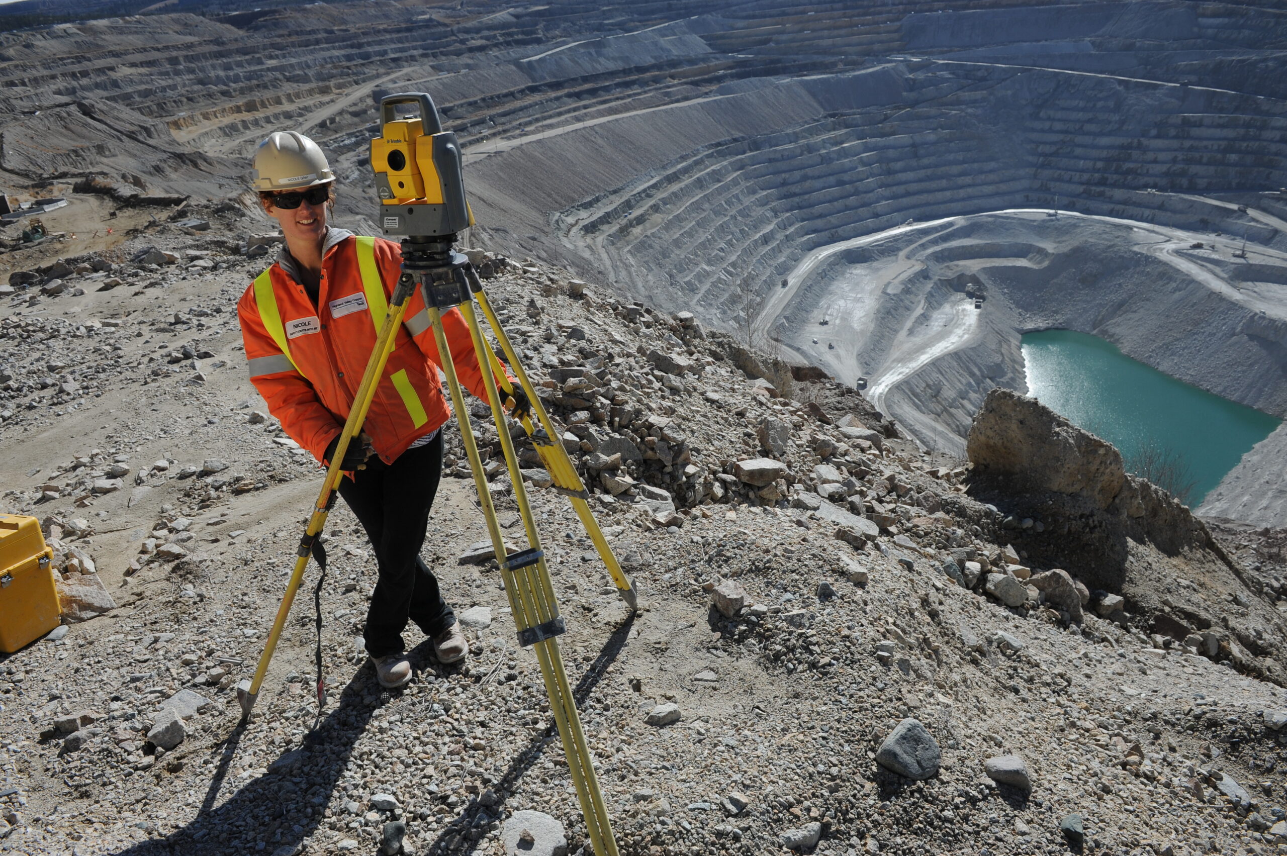 A person in a reflective vest is using survey equipment. Behind them is a deep valley with a surface copper mine and water at the bottom is visible.