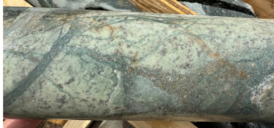 Hole 4 of the 2025 AZ exploration program tested a new porphyry target characterized by strong potassic alteration and visible copper sulphide mineralization within dioritic rocks cut by porphyry dikes. Surface sampling of outcrop near the collar location returned notable copper of 1.14% and gold of 5.73 g/t (Sample K155053), within chalcopyrite and minor bornite in disseminated and vein-hosted textures.